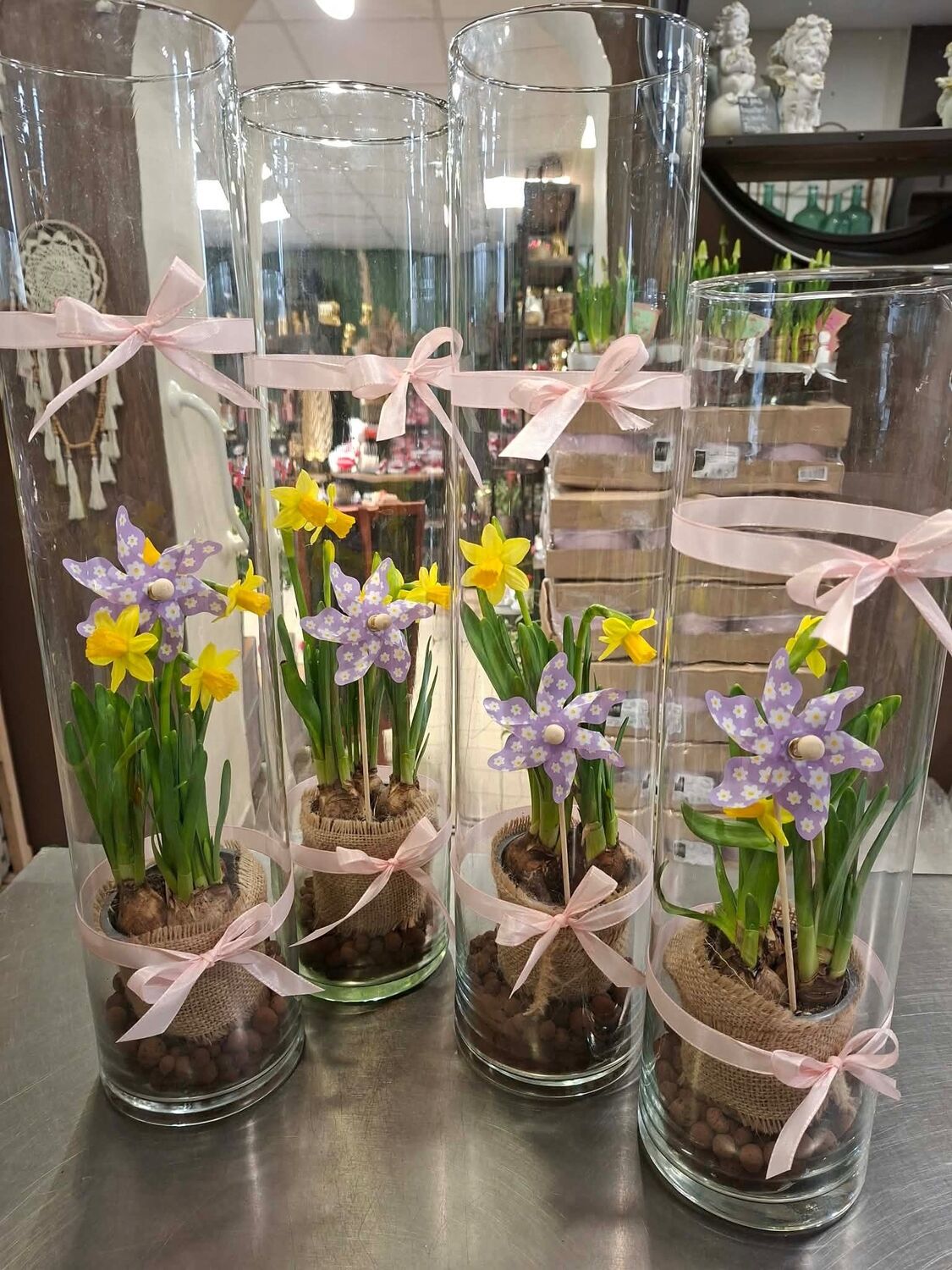 Nos bulbes de jonquilles présentés dans une élégante verrerie sont une invitation au printemps