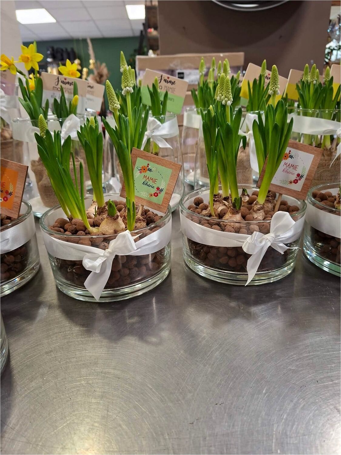 Nos bulbes de muscaris présentés dans une élégante verrerie apportent une touche de fraîcheur et de poésie à son intérieur